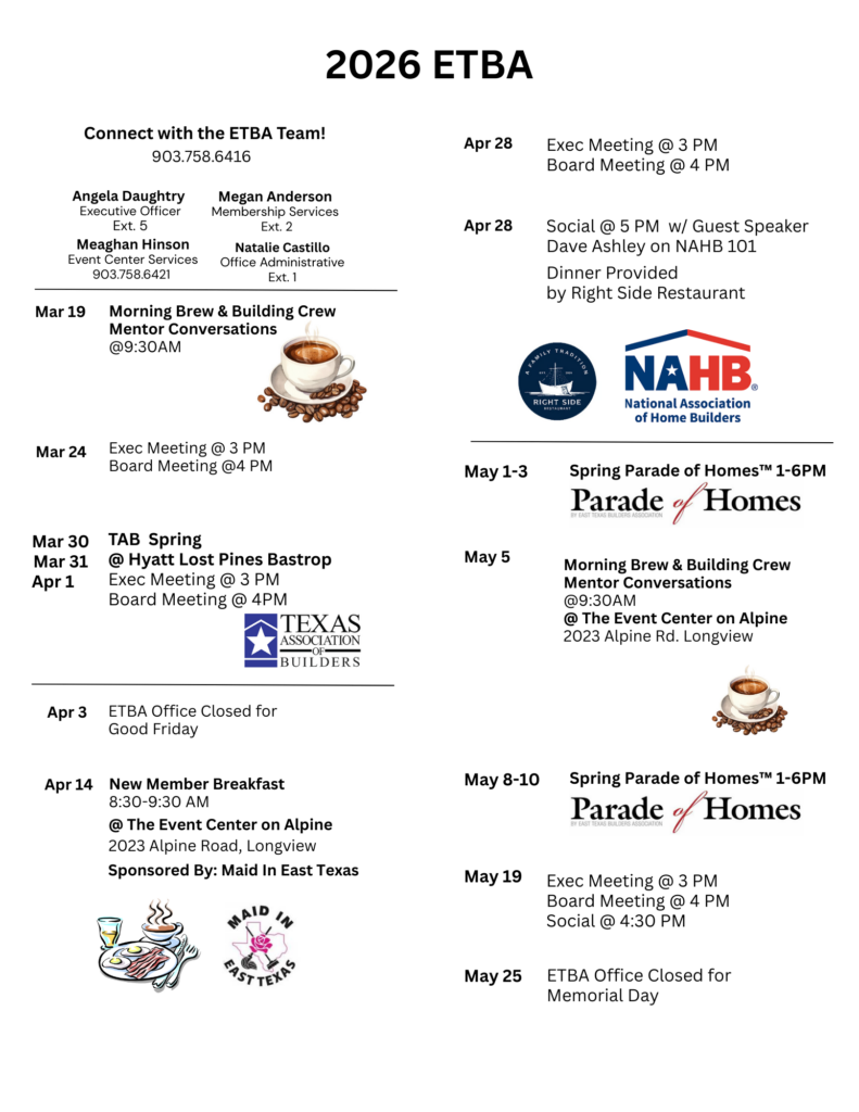 New Member BreakfastTue Apr 14 2026, 8:30am CDT - 9:30am CDTThe Event Center on Alpine- Membership DriveTue Apr 14 2026, 10:00am CDT - 12:00pm CDTThe Event Center on Alpine